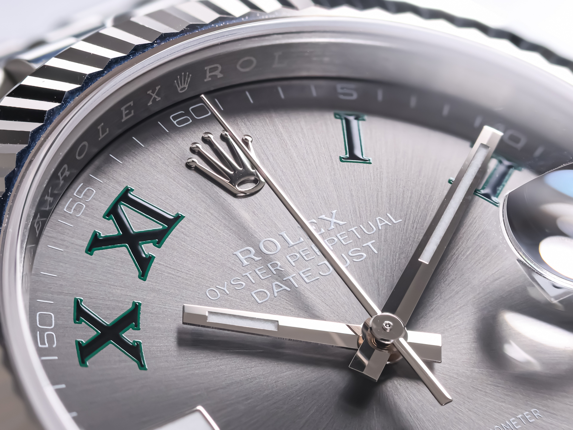 - Slate grey “Wimbledon” dial with green Roman numerals